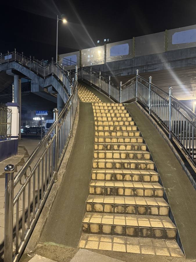 更让市民无奈的是,这座天桥地处交通要道,想绕行也极为困难。记者梳理周边路网发现,市民对这座天桥的依赖程度因方向而异:在国伟路北侧,若要从东侧前往西侧,由于轨道阻隔,该天桥是唯一通道,无法绕行;在国伟路南侧,从东侧前往西侧可步行约350米至殷行路,经红绿灯路口过街;在 中原路西侧,从南侧往北侧可步行约25米,利用停车场附近人行道直接过街;在中原路东侧,从南侧往北侧无地面过街通道,只能通过该天桥。可见,对于国伟路北侧及中原路东侧的老年居民、残障人士而言,这座天桥是无可替代的必经通道,而无障碍设施的缺失使其出行面临现实困难。